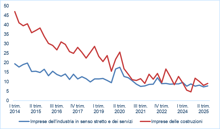 Le imprese segnalano una sostanziale stabilità sia nelle condizioni di accesso al credito sia nella propria liquidità, senza prevedere particolari criticità nel prossimo trimestre. Fra le imprese di costruzione, il 9% ritiene insufficiente la propria posizione complessiva di liquidità nei prossimi tre mesi mentre cresce la quota di imprese con condizioni di liquidità più che sufficienti. Per le imprese dell’industria in senso stretto e dei servizi, criticità nella gestione della propria liquidità è denunciata dal 7.8% del campione. Il settore costruzioni evidenzia un notevole progresso sotto questo punto di vista, con valori ben inferiori ai livelli critici del 2014. Per entrambi i macro-comparti produttivi, non si evidenzia dunque un deterioramento significativo del profilo di liquidità (vedasi Grafico 3).