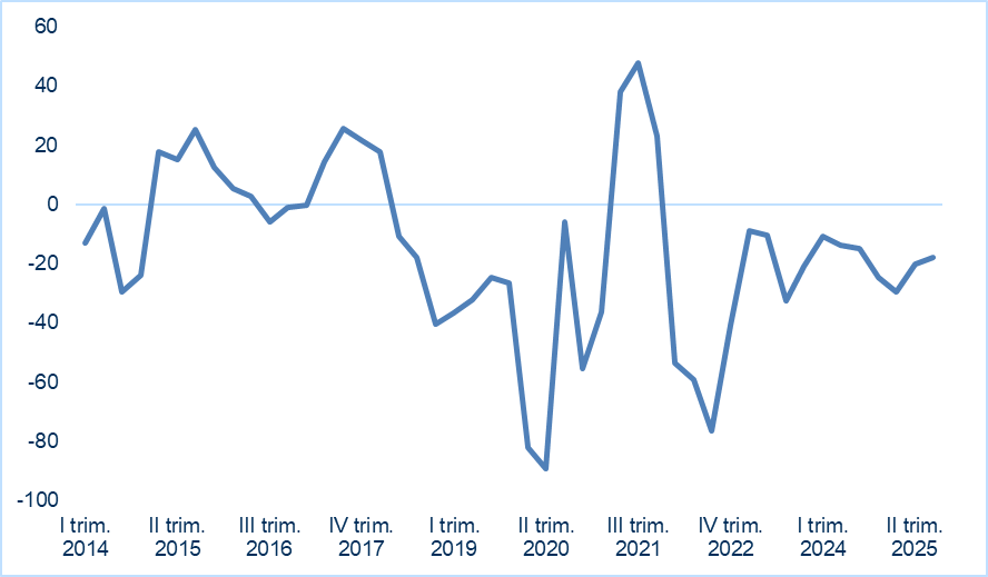 Il Grafico 1 mostra il giudizio sulla situazione economica generale rispetto al trimestre precedente (saldo tra i giudizi di miglioramento e di peggioramento rispetto a 3 mesi prima).