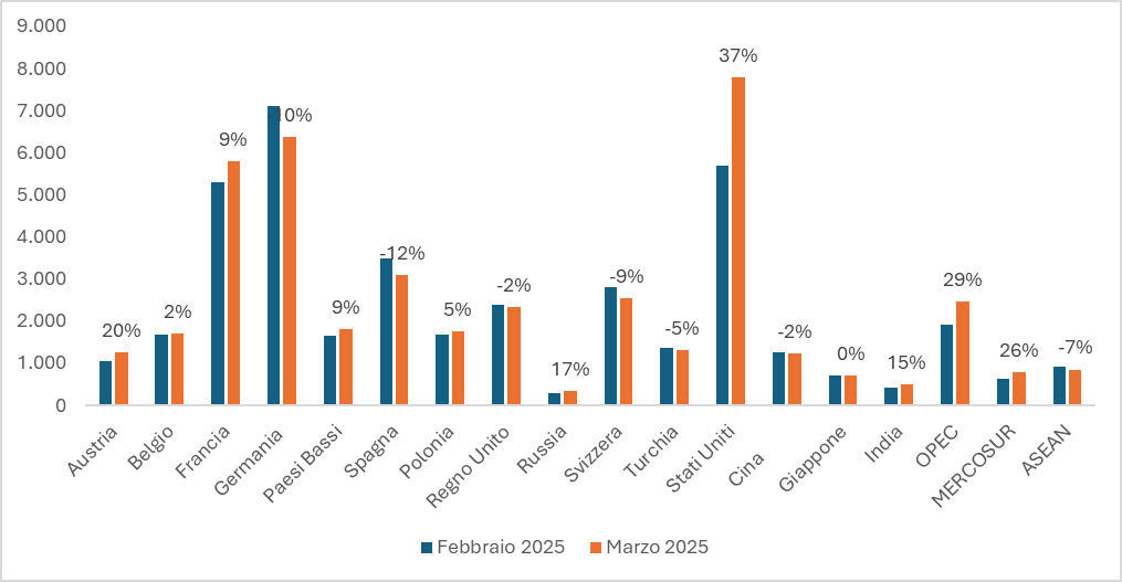 Quali sono i Paesi dove è cresciuto di più l’export mensile a marzo?